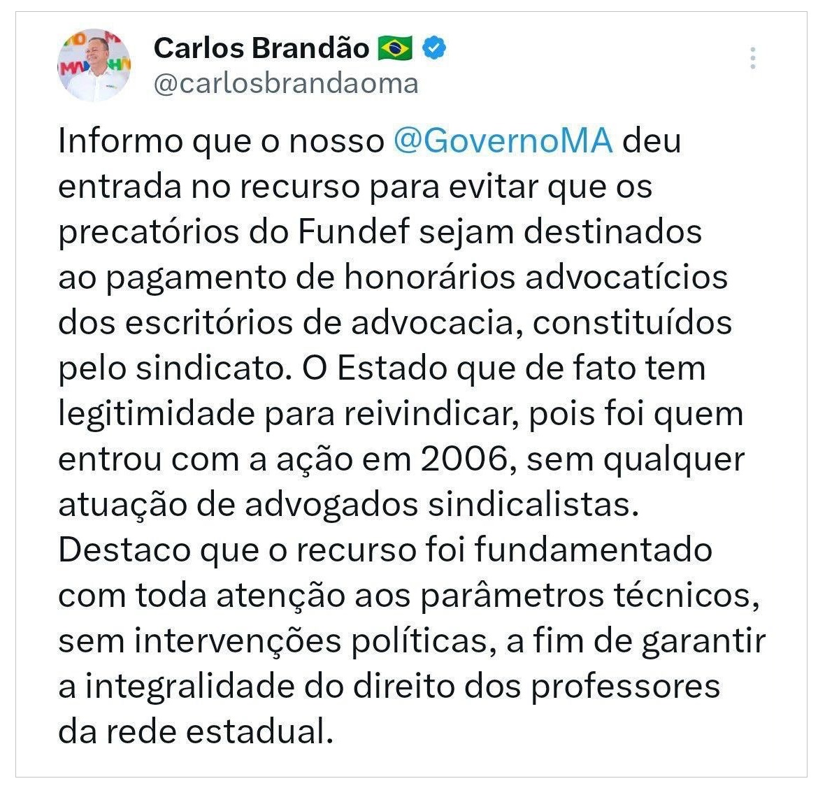 O governador do Maranhão, Carlos Brandão, anunciou neste sábado (18) que a Procuradoria Geral do Maranhão (PGE-MA) deu entrada no recurso para evitar o bloqueio de 15% do total dos recursos do precatório do Fundef para o pagamento de honorários advocatícios, requerido pelo Sindicato dos Trabalhadores em Educação Básica das Redes Públicas Estadual e Municipais do Estado do Maranhão (Sinproesemma).