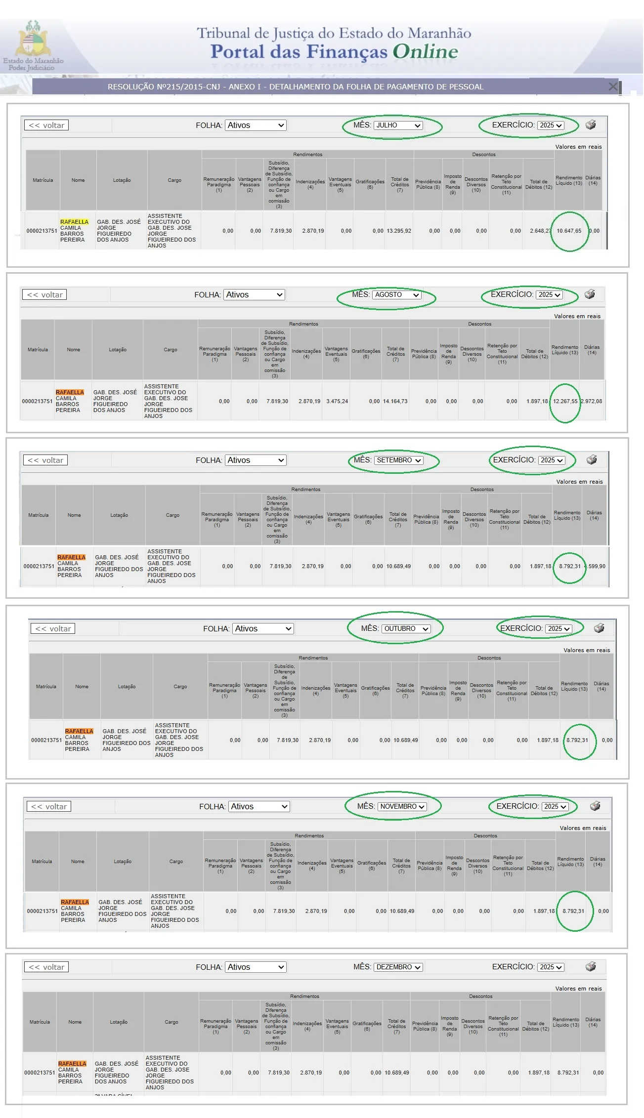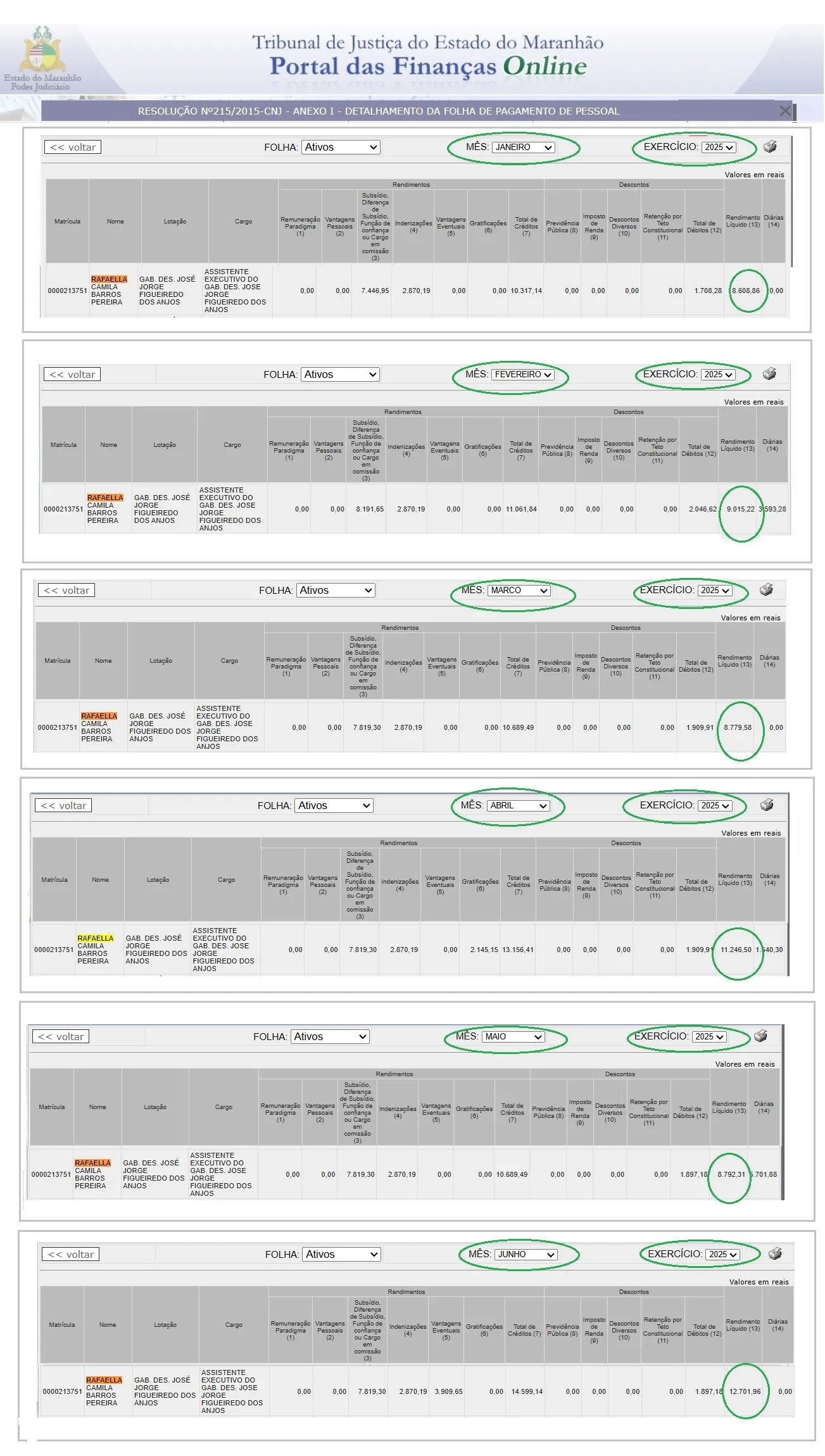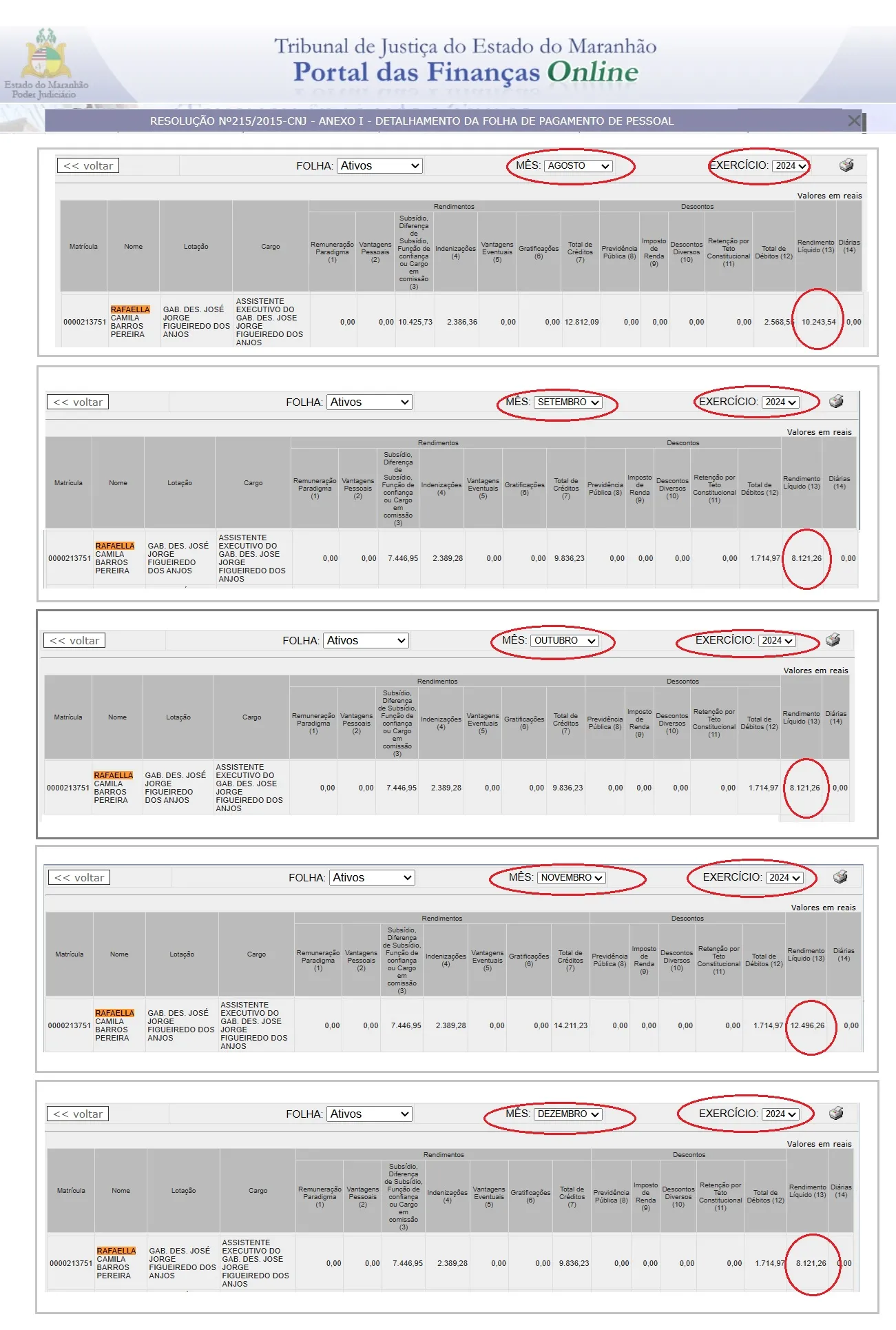 Sabe-se lá por quais cargas d’águas, o salário da “Assistente Executiva” varia mês a mês, conforme o Blog do Domingos Costa revela nos documentos abaixo – extraídos do Portal das Finanças Online, do Tribunal de Justiça de Maranhão, os valores da remuneração da filha do ex-vereador de São Luís, alternam de 8 mil reais, R$ 9 mil, 10 mil reais, R$ 11 mil, 12 mil reais até 15 mil reais.